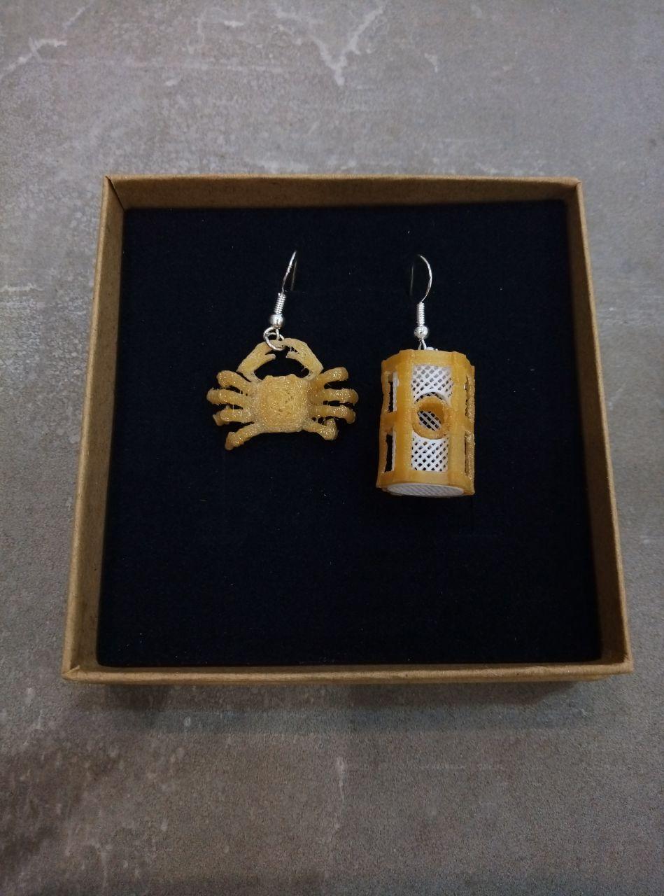 Brincos Nasa e Nécora deseñados pola equipa de Imprimetresde podes atopar estes fermosísimos brincos nasas como homenaxe ao tradicional aparello de pesca que consiste nunha especie de gaiola, normalmente de forma cilíndrica, feita de madeira, metal, xunco ou vimbio e recuberta de rede. Está disposta de tal maneira que permite a entrada do peixe ou do marisco pero non a súa saída. Def da RAG: https://academia.gal/dicionario/-/termo/nasa