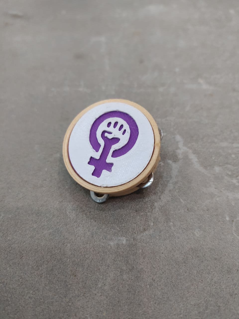 Broche Pandeireta Woman Power, deseñado pola equipa de Imprimetresde . Fermosísimo broche co símbolo feminista e con forma de pandeireta, instrumento que constitúe a base da música tradicional galega. Feita en cor lila, a cor da loita feminista. Asimesmo, dispón dunhas ferreñas metálicas que farán as delicias de calquer melóman@.