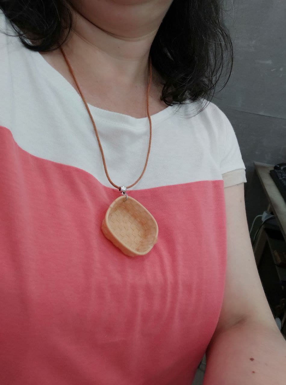 Colar Patela XL, idea orixinal de I3D en homenaxe a esas cestas cadradas de bordo baixo feita con tiras de madeira. As patelas eran utilizadas polas peixeiras para transportar o peixe. A peixeira é unha das figuras máis representativas da cultura mariñeira de Galicia, aparece case sempre representada cunha patela sobre a cabeza, sendo o elemento que mellor as define.