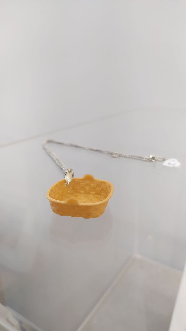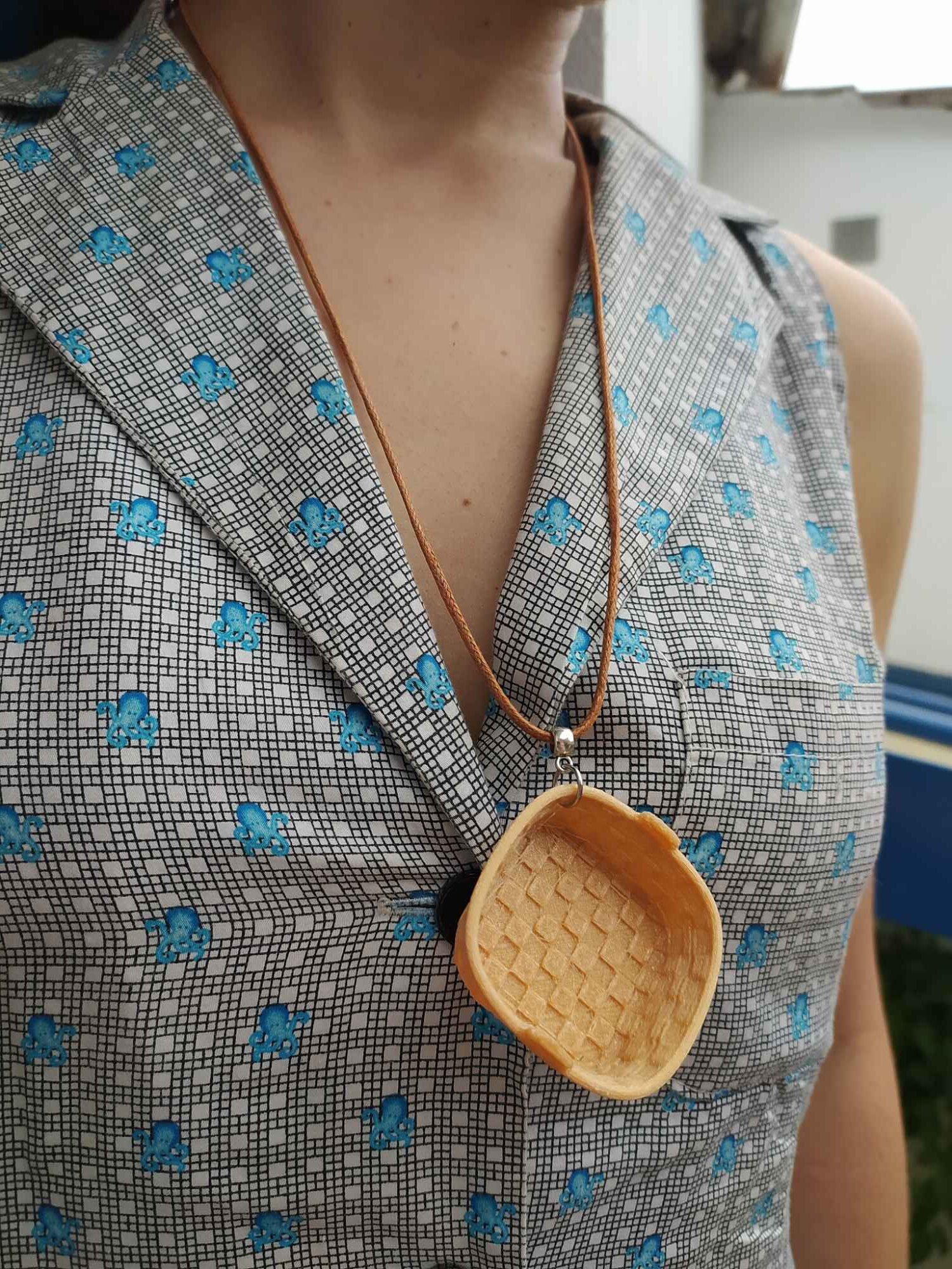 Colar Patela, idea orixinal de I3D en homenaxe a esas cestas cadradas de bordo baixo feitas con tiras de madeira. As patelas eran utilizadas polas mulleres peixeiras para transportar o peixe. A peixeira é unha das figuras máis representativas da cultura mariñeira de Galicia e aparece case sempre representada con este tipo de cesta sobre a cabeza, sendo o elemento que mellor as define.