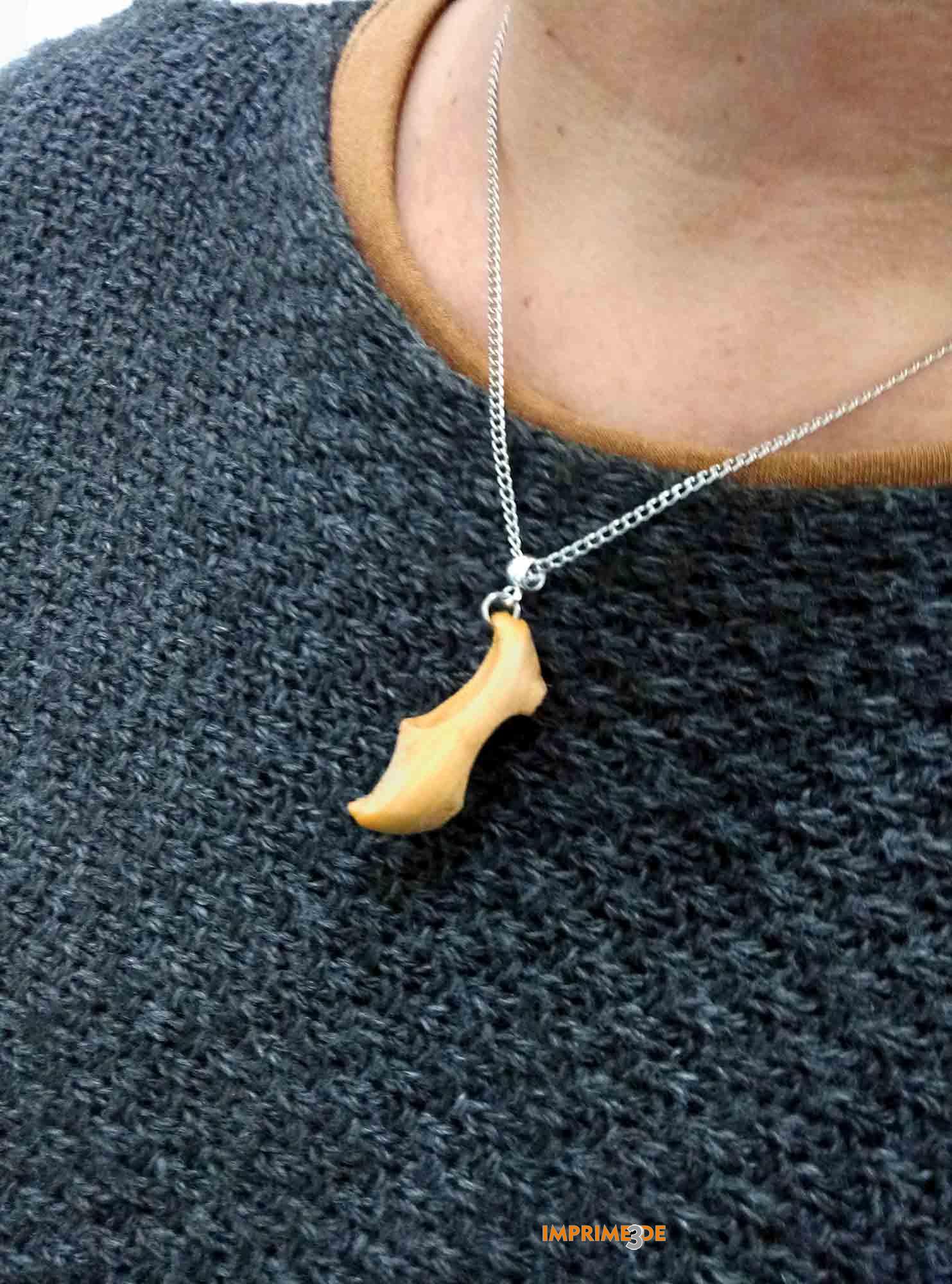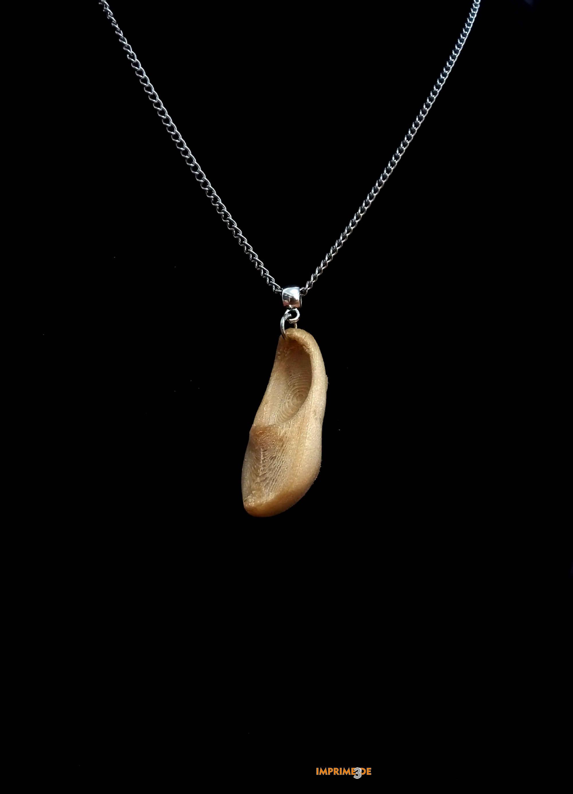 Colar Zoca, deseñado por Imprimetresde en homenaxe ao calzado galego tradicional. Está realizada en madeira WOODEN PLA, acompañado dunha elegante cadea. As zocas son calzado dunha soa peza enteiramente de madeira. Leva tacos ou chatolas para evitar a humidade. Cálzase sobre os pés protexidos por carpíns, zapatillas etc.