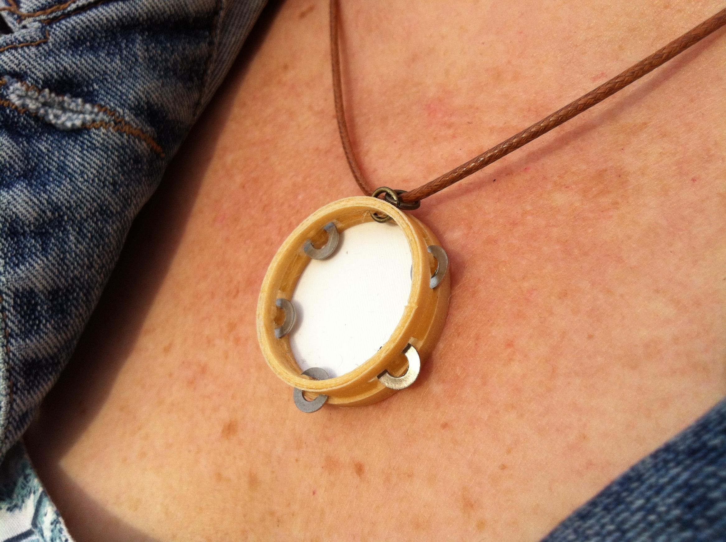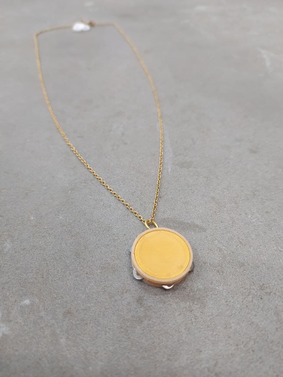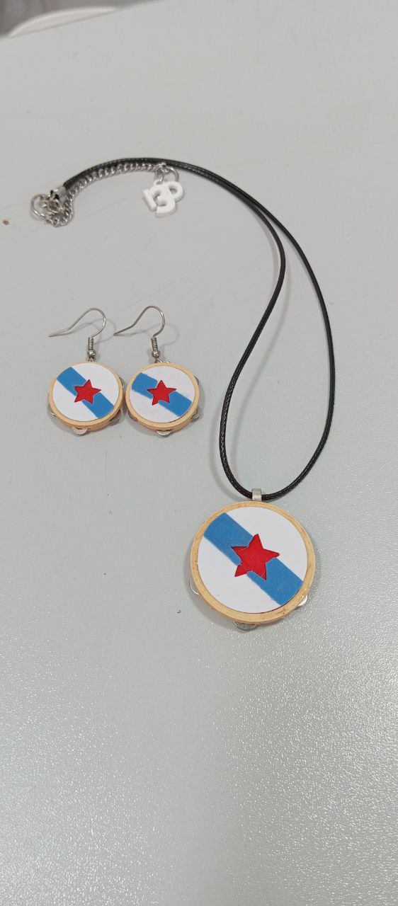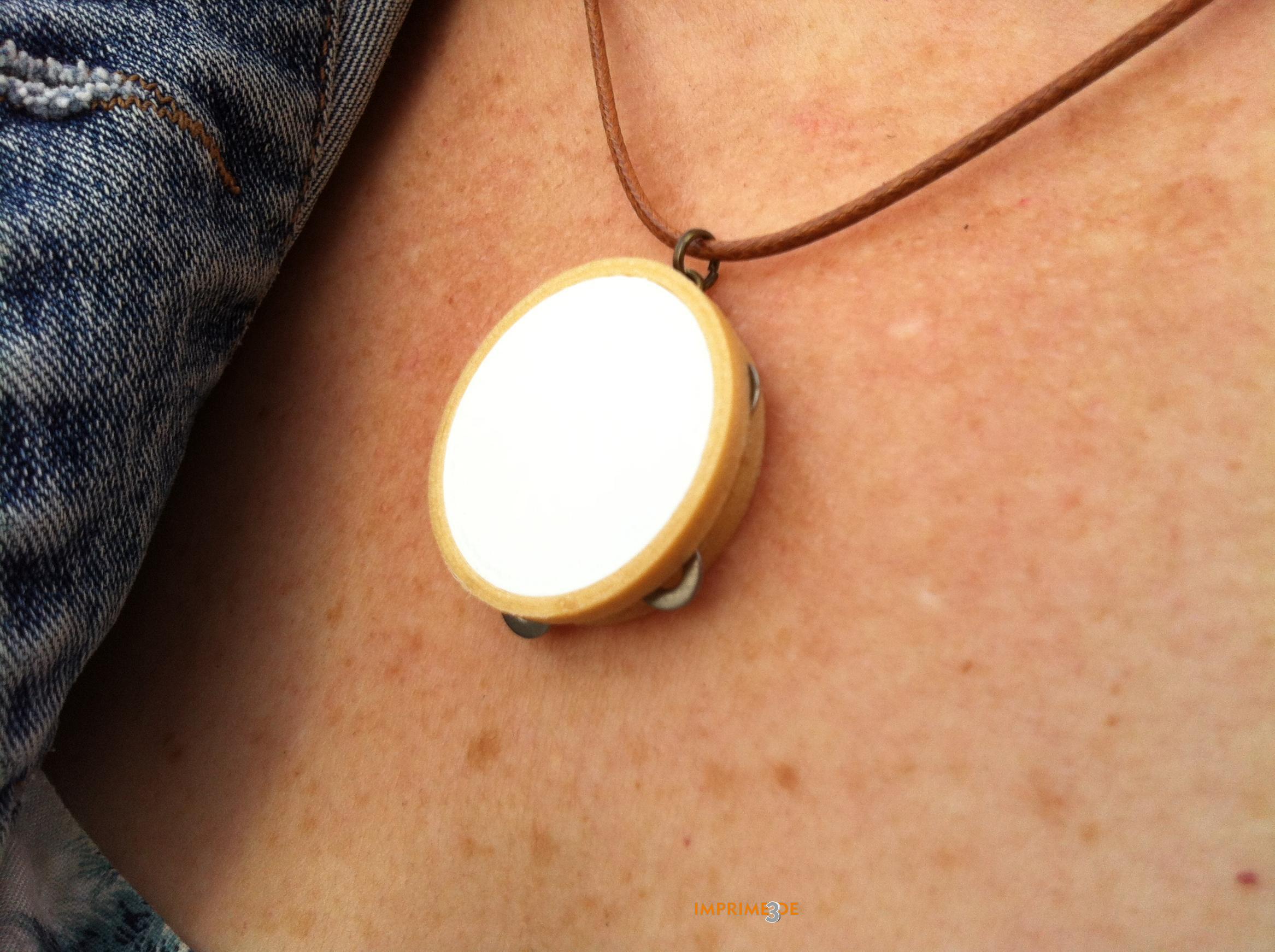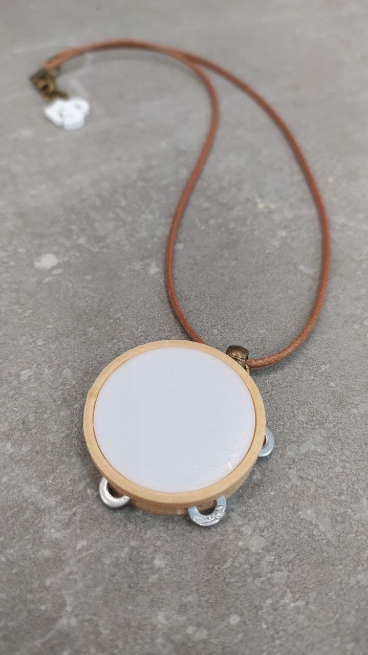 Colar Pandeireta deseñado por Imprimetresde, é unha homenaxe á nosa pandeireta, ese precioso instrumento que constitúe a base da música tradicional galega. Realizado en madeira imprimíbel (wooden PLA) e PLA, dispón dunhas ferreñas metálicas que farán as delicias de calquer melóman@.