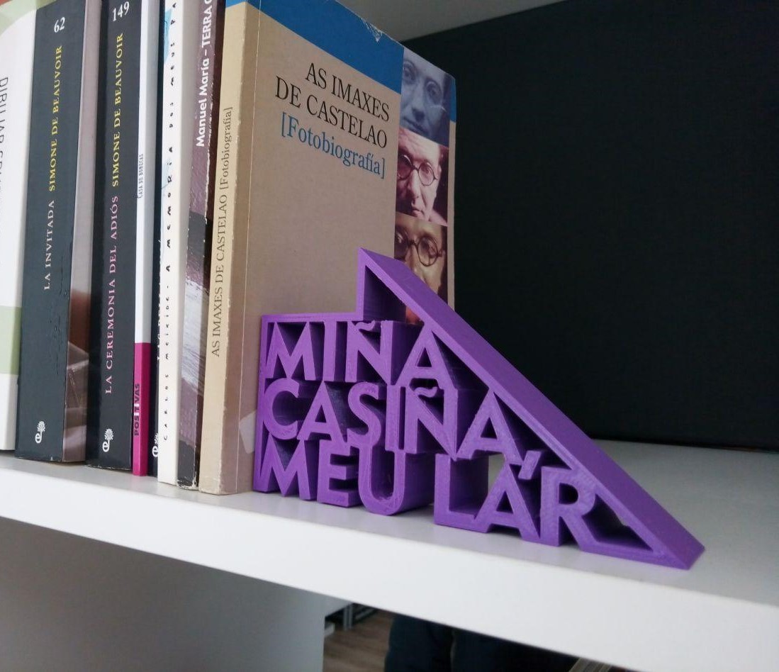 Miña casiña, meu lar. Suxeita libros decorativo deseñado pola equipa de Imprimetresde dentro da Colección Rosalía, en cor gris e co verso “Miña casiña, meu lar”. Extracto dun poema de Follas Novas e en homenaxe Rosalía de Castro, a nosa escritora máis internacional: