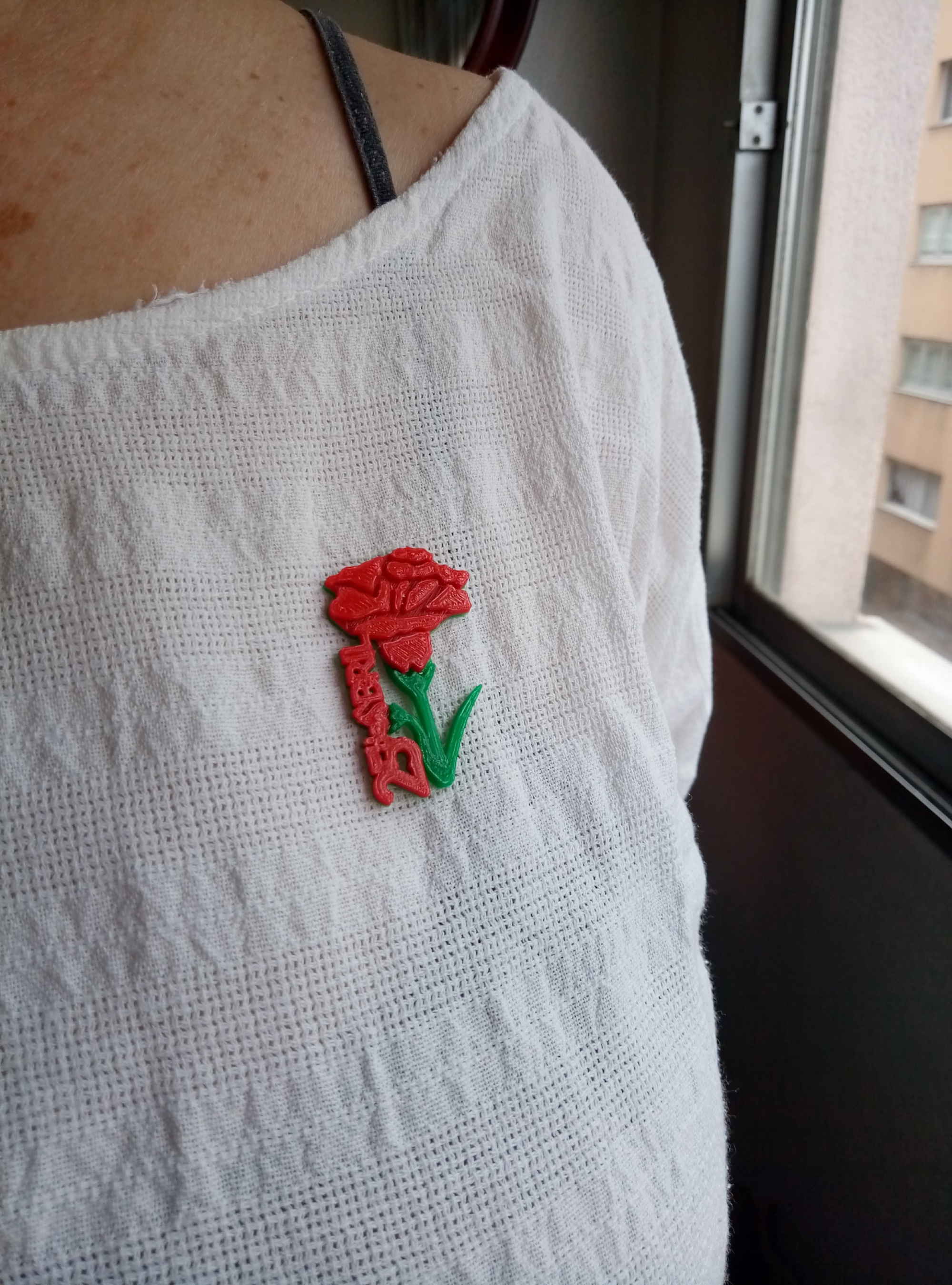 Pin 25 de Abril deseño orixinal de Imprimetresde para conmemorar a “Revolução dos Cravos”, un evento da historia de Portugal resultante do movimento político e social, acontecido o 25 de abril de 1974 e que depón o réximen dictatorial do Estado Novo