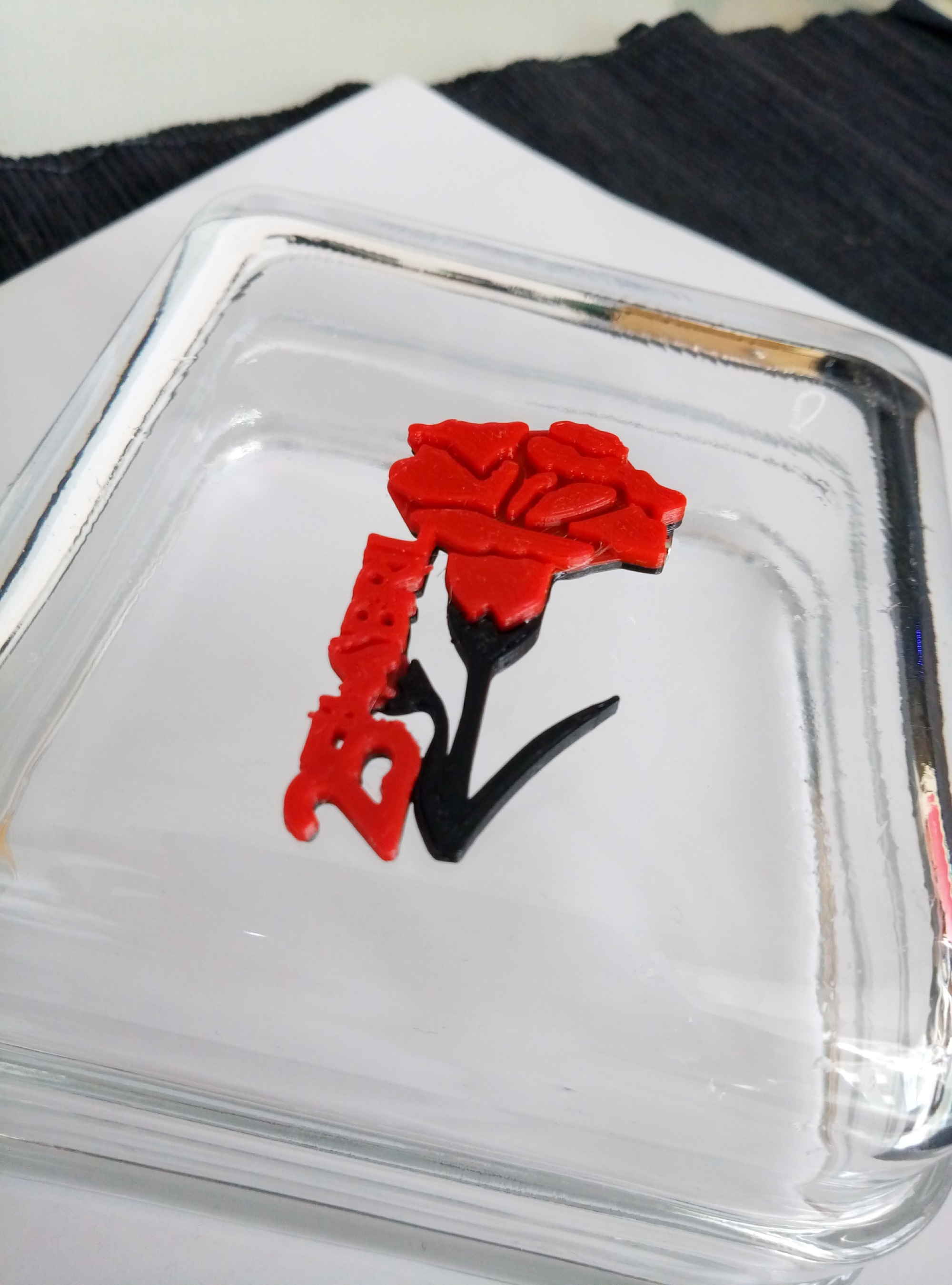 *O material no que está realizado é PLA, en dúas cores (vermello e verde, e vermello e negro). É un material que procede de materia vexetal, biodegradábel, non tóxico e ecolóxico