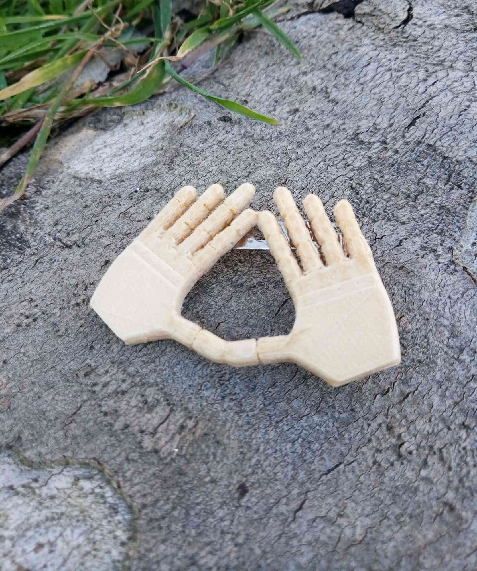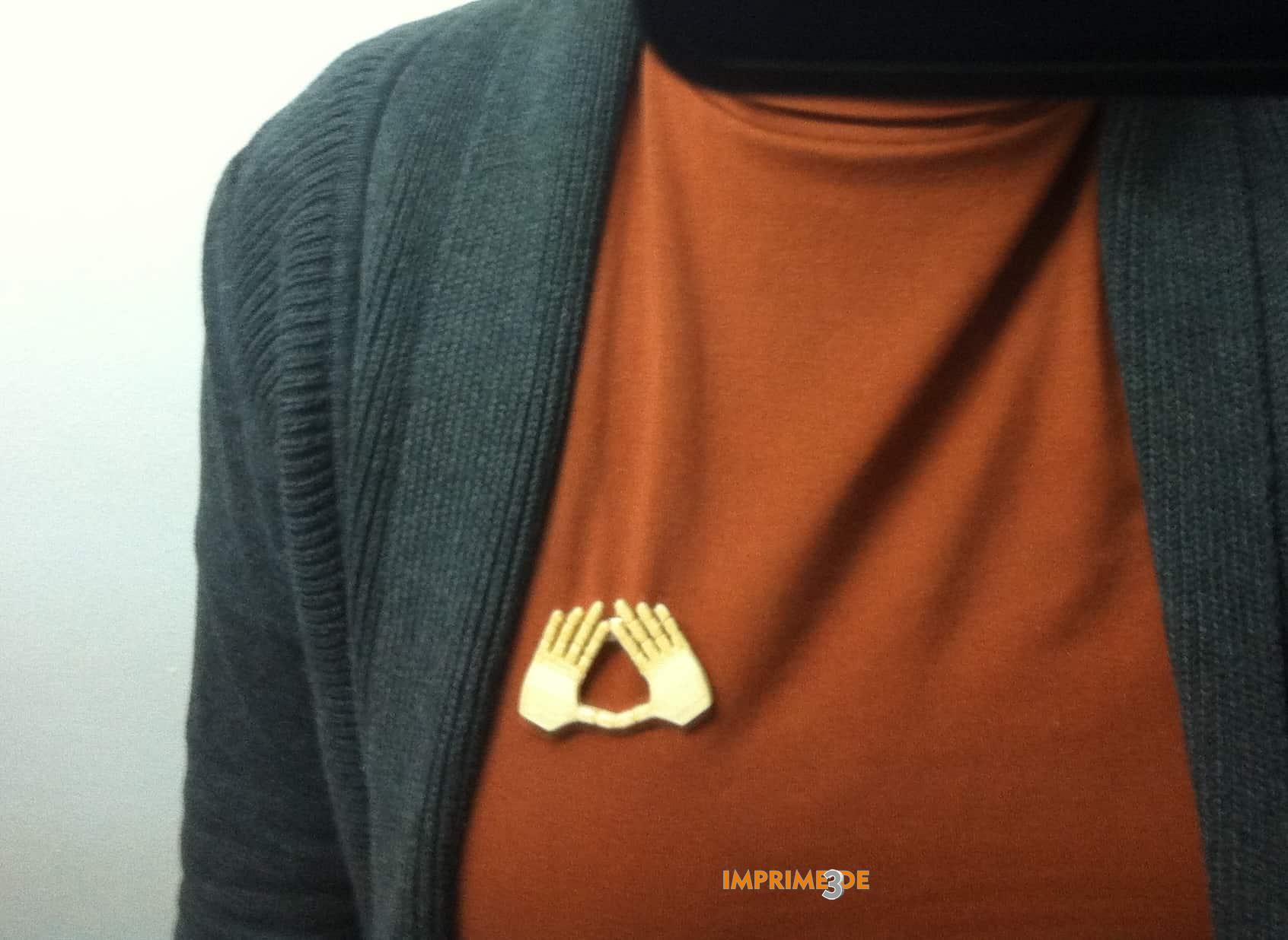 Broche Más Feminismo, nueva creación del equipo I3D y realizado en madera imprimible (wooden PLA). El símbolo representa un gesto reivindicativo feminista. Asimismo, es identificativo del movimento.
