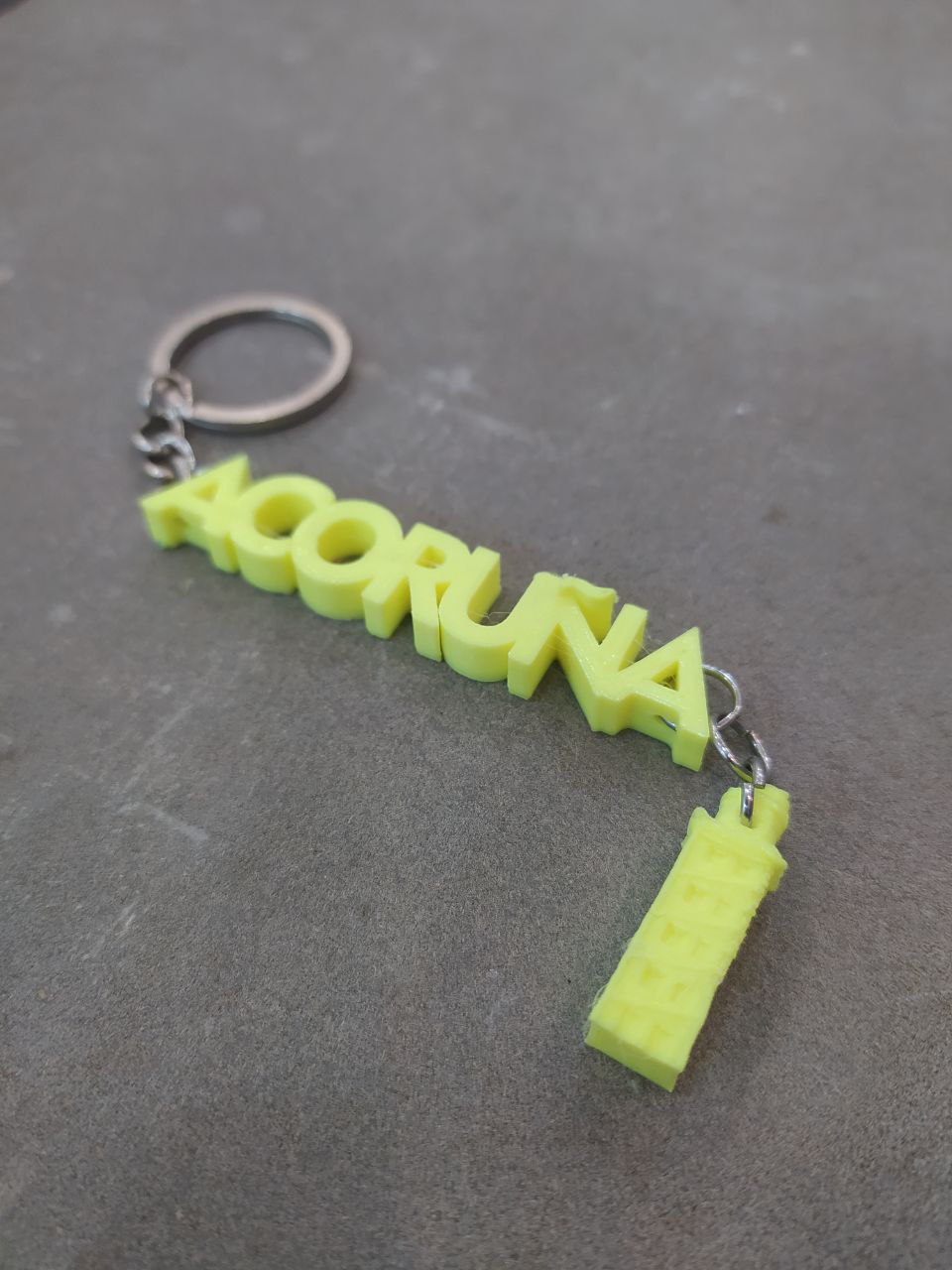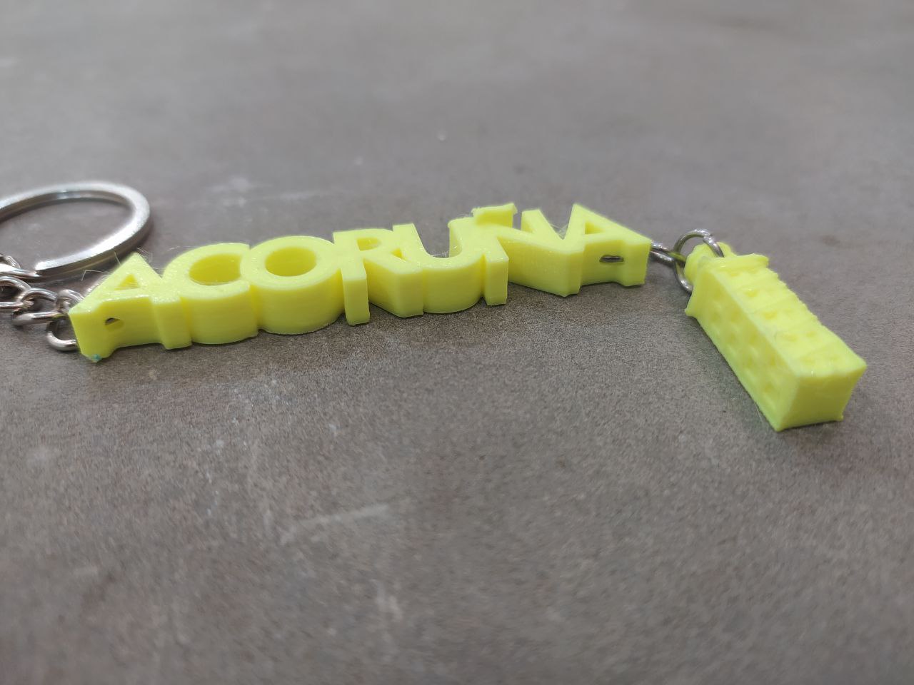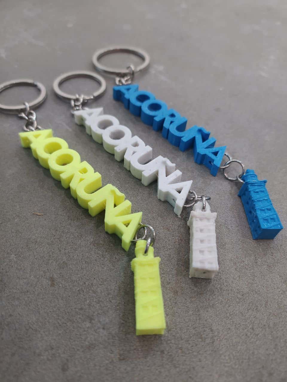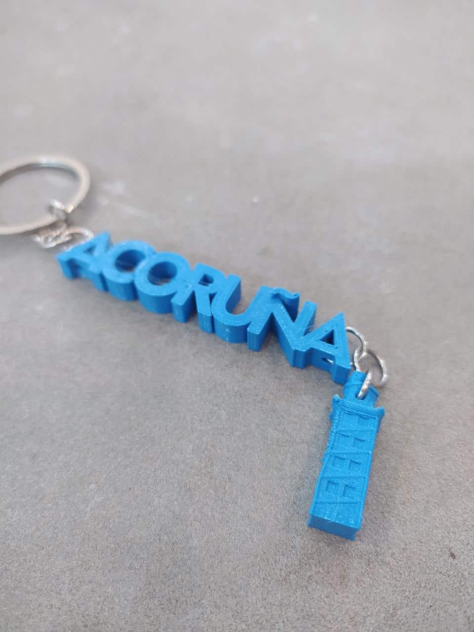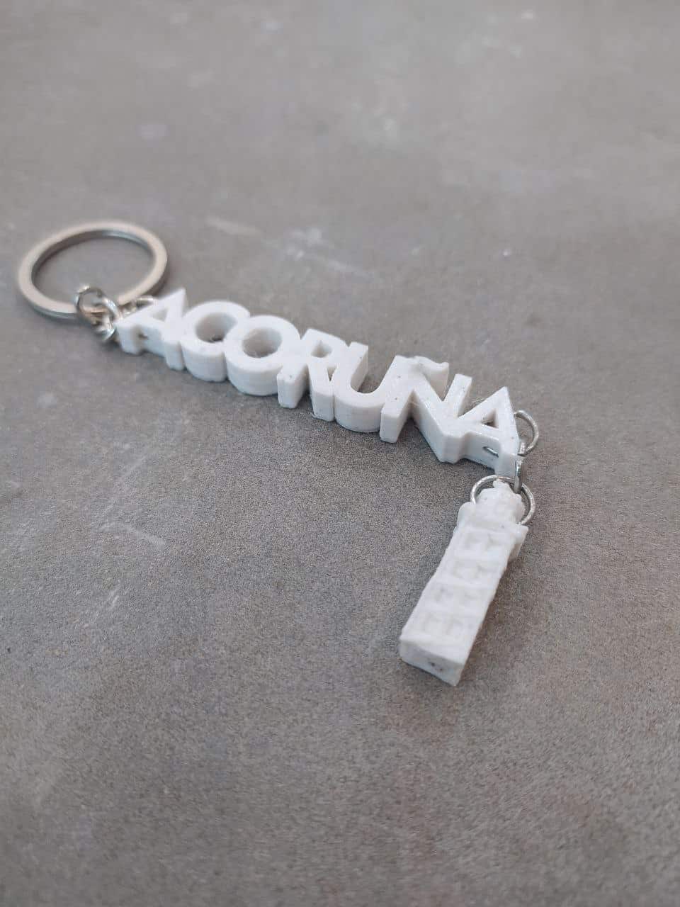 Llavero A Coruña con torre, diseño exclusivo de Imprimetresde . Llavero con el nombre de la ciudad de A Coruña y que lleva colgada una pequeña réplica de la Torre de Hércules de A Coruña, declarada Patrimonio de la Humanidad en 2009. La torre pequenita se mueve y está todo impreso en diferentes y divertidos colores para que lleves contigo y como recuerdo un pedazo de la ciudad!