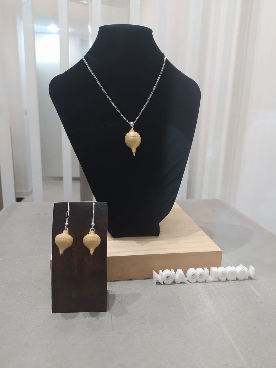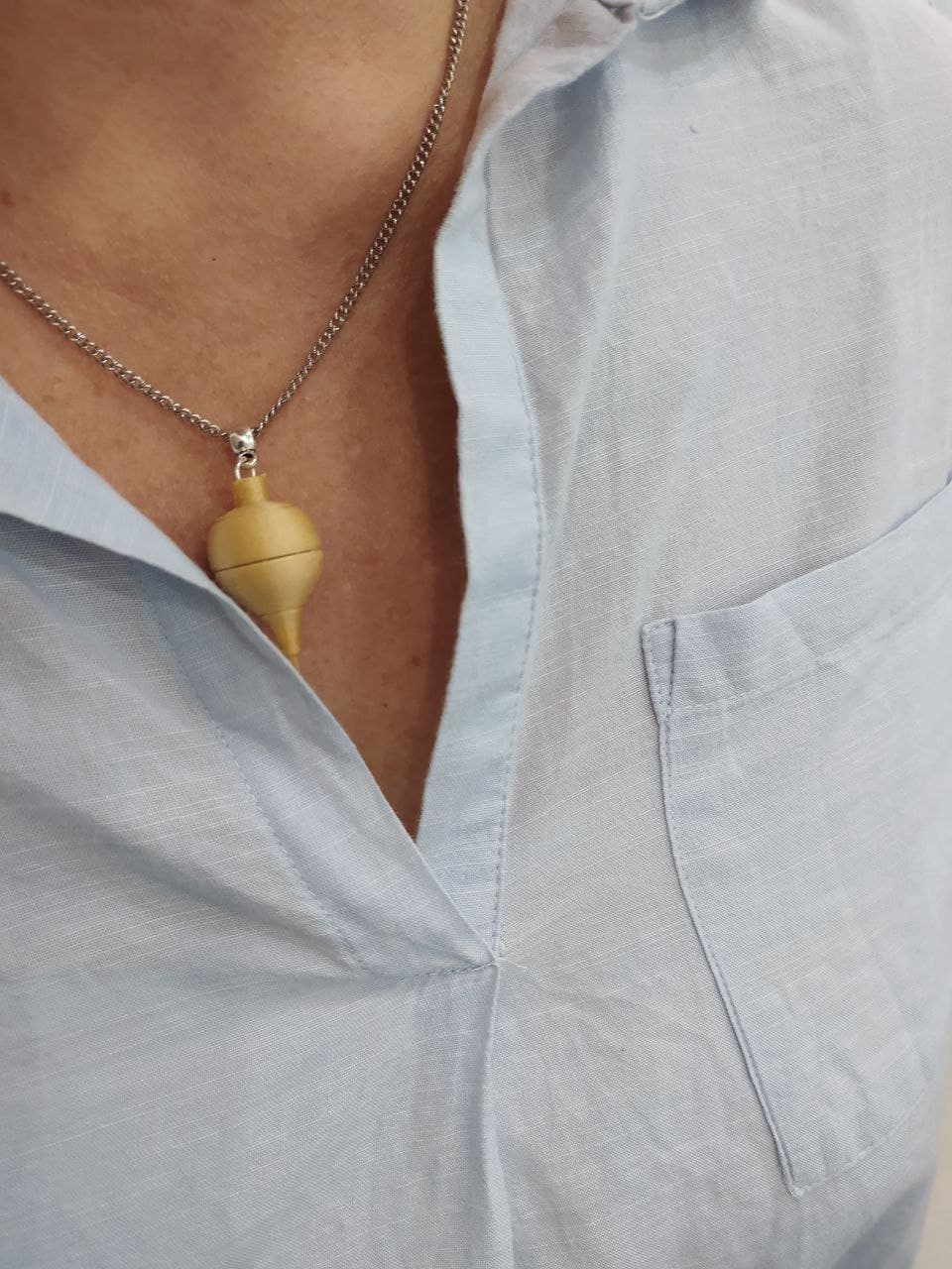 Collar peonza diseñado por Imprimetresde en homenaje al juguete tradicional del mismo nombre. Dicho juguete consiste en una pieza de madera de forma cónica, rematada en punta de metal en la parte inferior y que se hace bailar por medio de un cordel. Asimesmo, imitamos la pieza haciéndola en madera imprimible.