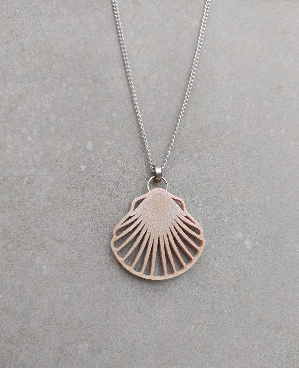 Collar Vieira diseño original de Imprimetresde. Hecho en madera, con mucho estilo y en homenaje a la concha de Vieira: La concha da vieira es el símbolo por excelencia del peregrino y de la peregrina en el Camiño de Santiago. La razón es que, al ser típica de las costas de Galicia, l@s peregrin@s la llevaban a sus lugares de origen como prueba de que habían llegado hasta el final del viaje. En realidad, Linneo le dio el nombre de Pecten jacobeus, o concha de Santiago, a la vieira do Mediterráneo, noa la especie propia de las costas atlánticas