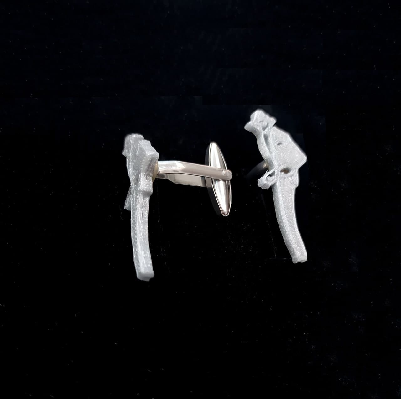 Gemelos Castelao, idea original de I3D. Par de gemelos ideados para unir los cuatro puños en que finaliza cada manga de una camisa de puño doble o una camisa de puño mixto.