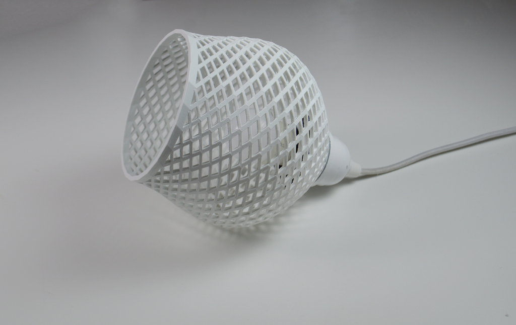 El papel de arroz del acabado de la lámpara de pie Regolit de IKEA no es el material más duradero. Cuando Samuel Bernier (LeFab Shop) encontró una Regolit con un desgarro pero totalmente operativa, decidió reemplazarlo con una cubierta 3d impresa de su propio diseño. Utilizó SolidWorks para dar forma a una serie de formas bulbosas e imprimirlas, primero en su Impresora UP! 3-D, y luego en su MakerBot Replicator 2.