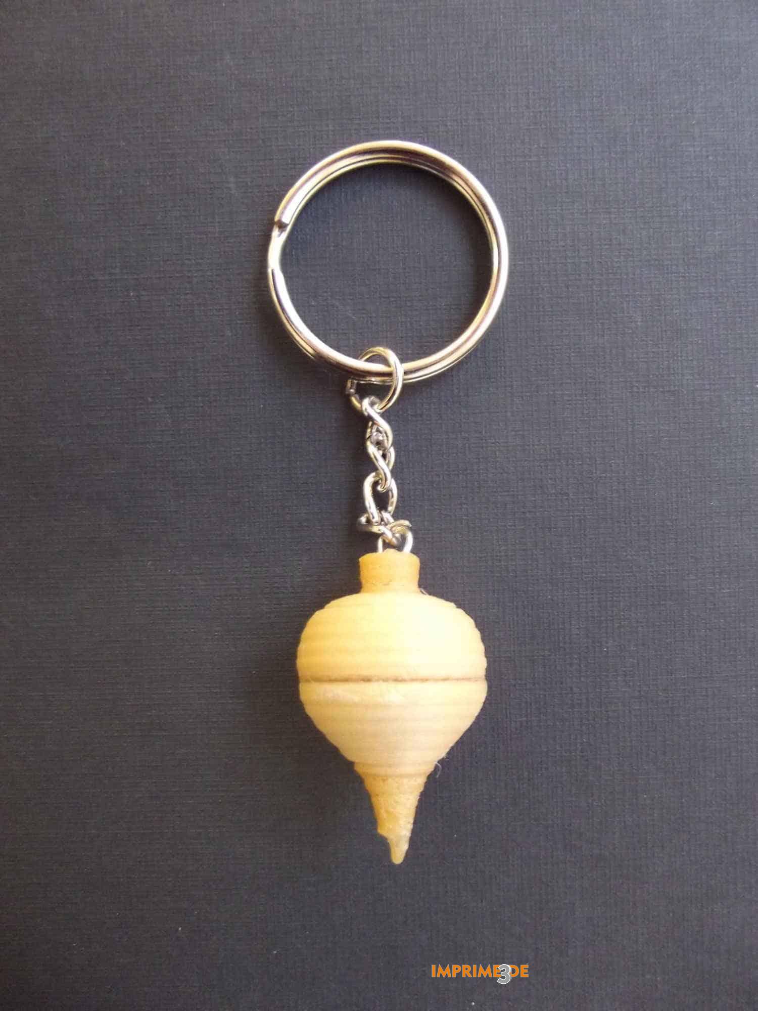 Llavero peonza diseñado por Imprimetresde en homenaje al juguete tradicional del mismo nombre. Dicho juguete consiste en una pieza de madera de forma cónica, rematada en una punta de metal por la parte inferior y que se hace bailar por medio de un cordel. Asimismo, imitamos la pieza haciéndola en madera imprimible (WOODEN PLA)