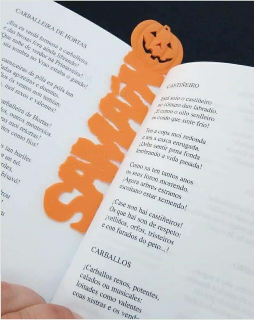 Marcapáginas de Samaín en color naranja. Figura conmemorativa del Samaín, una fiesta asociada al ciclo anual del sol que ya forma parte del Patrimonio Inmaterial de Galicia y el Norte de Portugal. La recuperación de la tradición involucra a varias escuelas que promueven actividades que a su vez son utilizadas en la promoción de la candidatura a Patrimonio Inmaterial.