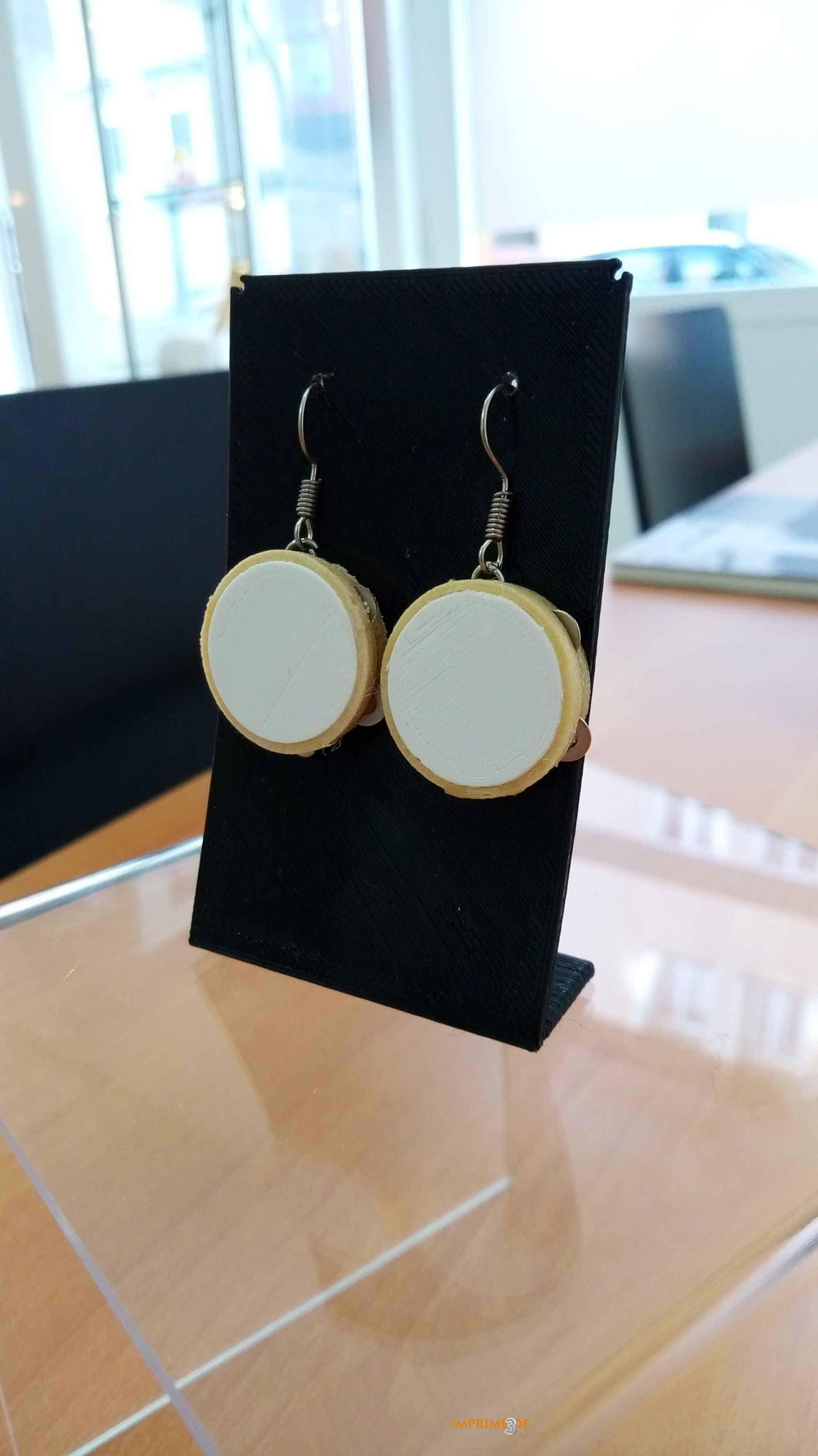 Pendientes Pandereta diseñados por el equipo de Imprimetresde . Hermosos pendientes Pandeireta como homenaje a nuestra pandeireta, ese maravilloso instrumento que constituye la base de la música tradicional gallega. Realizado en madera imprimible (wooden PLA) y PLA, dispone de unas “ferreñas” metálicas que harán las delicias de cualquier melóman@.
