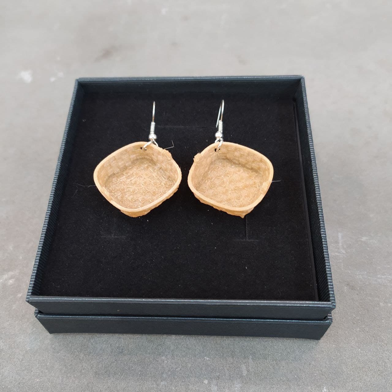 Pendientes Patelas, idea original de I3D en homenaje a esas cestas cuadradas de borde bajo hecha con tiras de madera. Las patelas eran utilizadas por las mujeres “peixeiras” para transportar el pescado. La pescadera es unha de las figuras más representativas de la cultura marinera de Galicia, aparece casi siempre representada con este tipo de cesta sobre la cabeza.